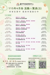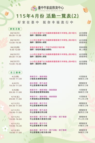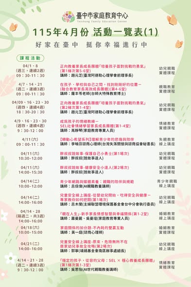 [轉知]臺中市家庭教育中心115年4月份活動一覽表,誠摯邀請您一起參與